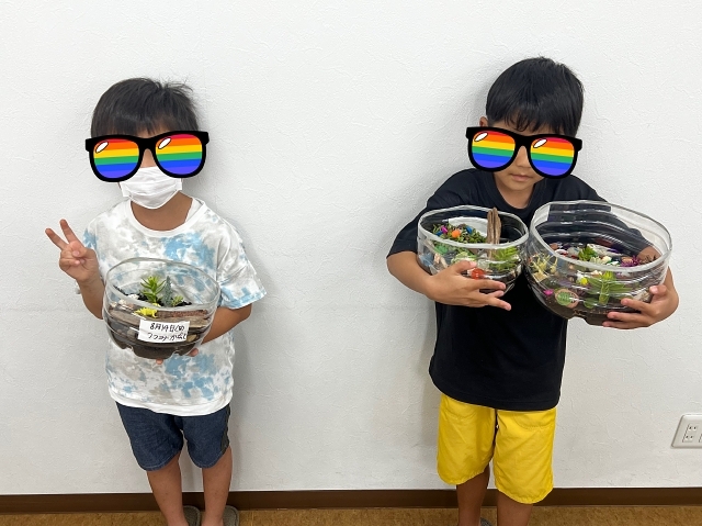 子どもの創造力は素晴らしくこちらのアドバイスは全くなくて、スイスイと素敵な箱庭を2個ずつ作ってくれました。